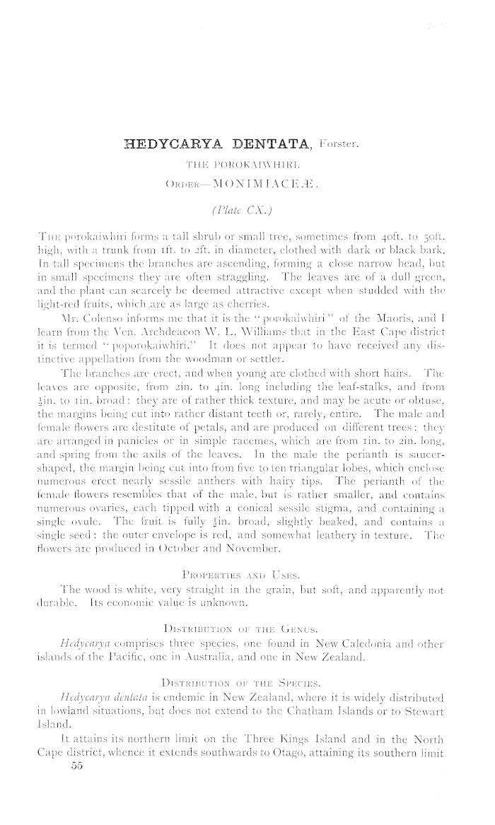 The preparation of a descriptive account of the economic trees and shrubs comprised in the New Zealand flora was authorised by the Hon. John Ballance, late Minister of Lands, and confirmed by his successor in office, the Hon. G. Richardson. The primary objects of the work are to diffuse a knowledge of the forest resources of the colony —to describe the chief methods of working and conversion employed, and to establish a uniform series of common names. The last object, especially, is one of considerable importance, as, owing to the loose manner in which common names are generally employed in the colony, timbers of but little value are frequently used instead of the kinds specified, often causing needless expenditure and great inconvenience. One instance may be mentioned here: At least a dozen kinds of small-leaved trees are termed "birch," with the prefix "black," "white," "red," "brown," "grey," or even "yellow" applied, as the imagination of the bushman may suggest, scarcely any two bushmen being agreed as to the correct application of the qualifying term, while architects and contractors for the most part are but little better informed. The brown-birch of Otago is the white-birch of Nelson; the whitebirch of Westland, again, is a totally different tree; the black-birch of Auckland is termed red-birch in Wellington, brown-birch in some parts of Nelson, while in Otago it appears to be termed indifferently black-birch or red-birch. Other cases where similar confusion exists will be found recorded in various parts of this work.