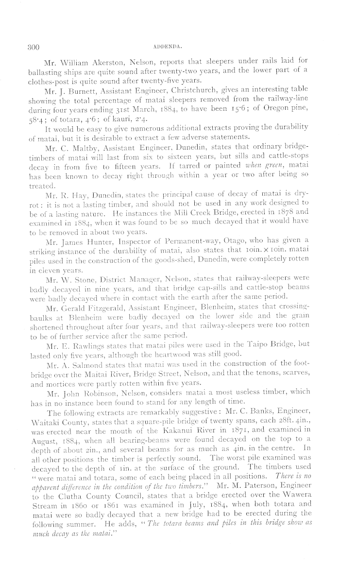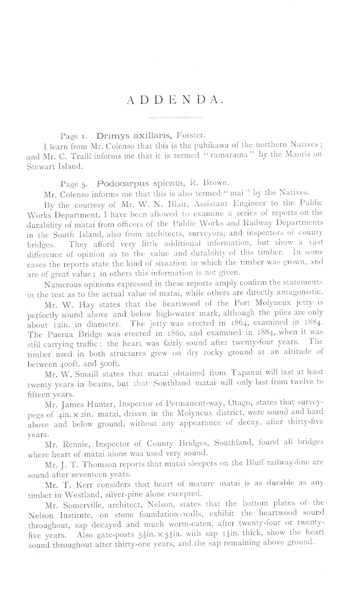 The information at my disposal on this subject is less complete in all cases than could be desired, and in some instances is very defective. In 1865 the late Mr. J. Melville Balfour, Marine Engineer, prepared a report embodying the results of a series of Experiments on the Strength of New Zealand Woods, which exhibits a vast amount of careful and patient labour. Until lately it was the only authority on the actual and relative strength of New Zealand timbers, but in 1879 Mr. W. N. Blair, Assistant Engineer in the Public Works Department, published the results of experiments made to determine the strength of Otago timbers. The series of experiments on kauri, conducted by Mr. T. Laslett, Timber Inspector to the British Admiralty, is, however, of the highest