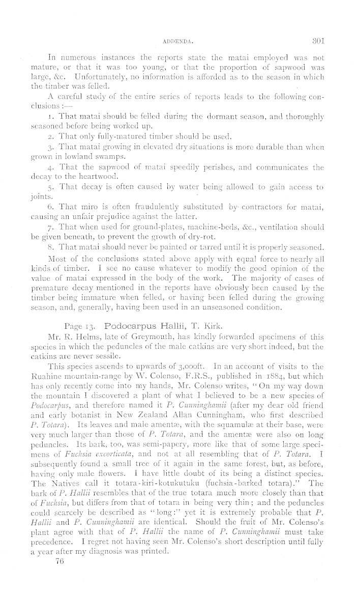 In the great majority of cases the Maori names are much better adapted for commercial use than those commonly employed; happily, no attempt has been made to replace "kauri," but the unmeaning names of "red-pine," "black-pine," "white-pine," &c., are inferior to rimu, matai, and kahikatea, as they are employed in other countries to distinguish different kinds of timber, and are moreover liable to be confused with each other. This is shown by the fact that the red-pine of the Nelson district is termed black-pine in other parts of the colony.