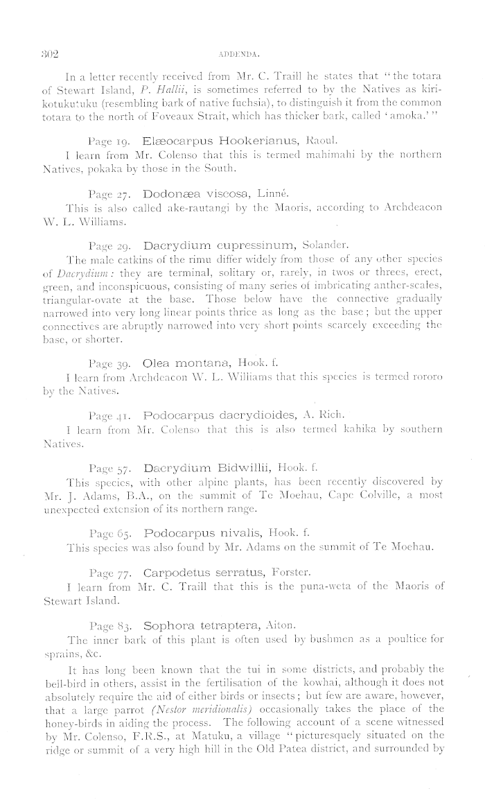 Considerable difficulty has been experienced in ascertaining the Native names of many species, and it can scarcely be hoped that all errors have been avoided. Mr. Colenso and Maori scholars generally have borne testimony to the precise application of names to plants and other natural objects by the older