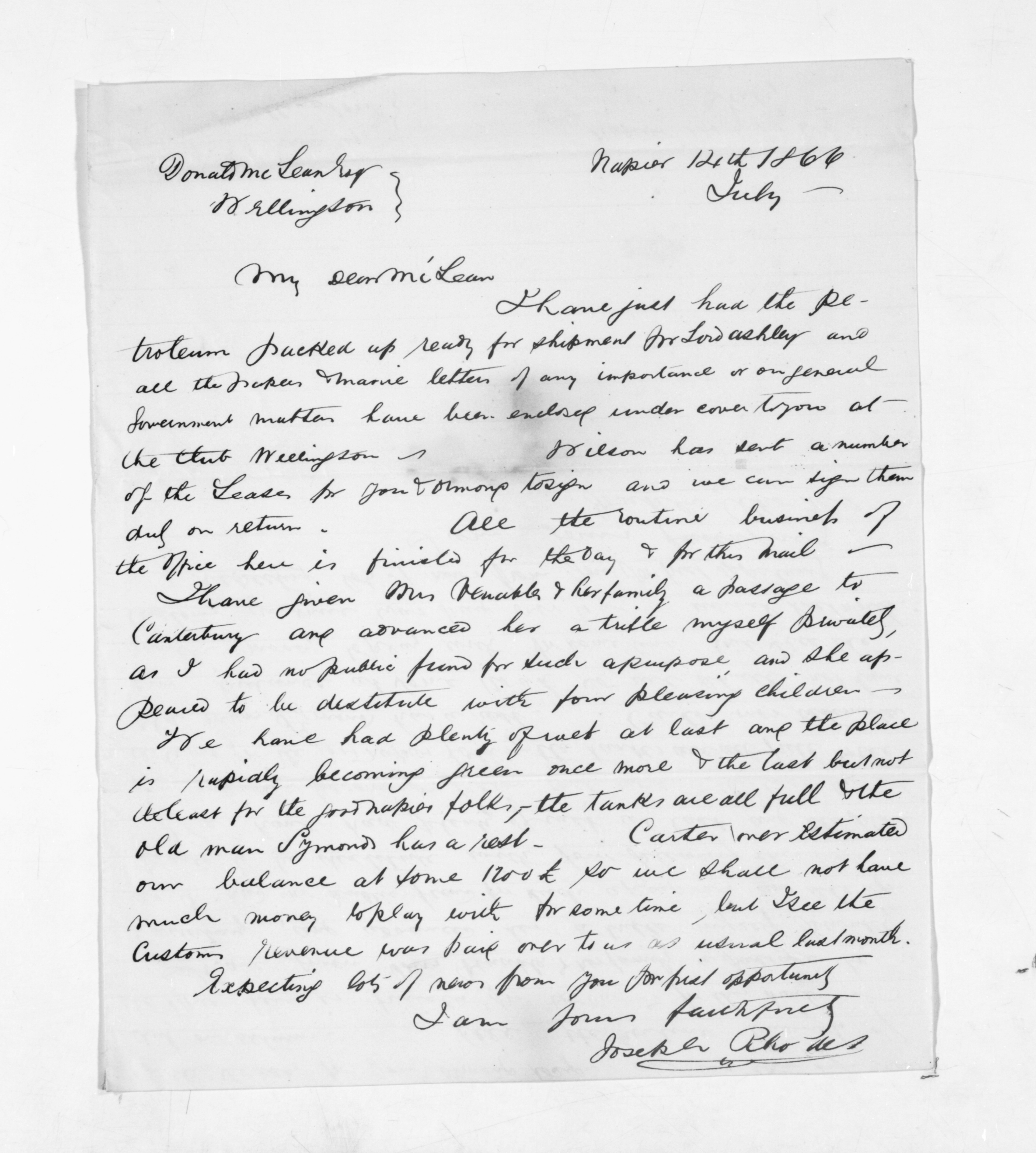 Napier 14th July 1866 Donald McLean Esq. Wellington My Dear McLean I have just had the petroleum packed up ready for shipment per Lord Ashley and all the papers and Maorie letters of any importance or on general Government matters have been enclosed under cover to you at the club Wellington - Wilson has sent a number of the Leases for you and Ormond to sign and we can sign them duly on return. All the routine business of the office here is finished for the day and for this Mail - I have given Mrs. Venables and her family a passage to Canterbury and advanced her a trifle myself privately, as I had no public fund for such a purpose and she appeared to be destitute with four pleasing children - We have had plenty of wet at last and the place is rapidly becoming green once more and the last but not the least for the good Napier folks - the tanks are all full and the old man Symonds has a rest - Carter over estimated our balance at some 1200£ so we shall not have much money to play with for some time, but I see the Customs revenue was paid over to us as usual last month. Expecting lots of news from you per first opportunity. I am, Yours faithfully, Joseph Rhodes