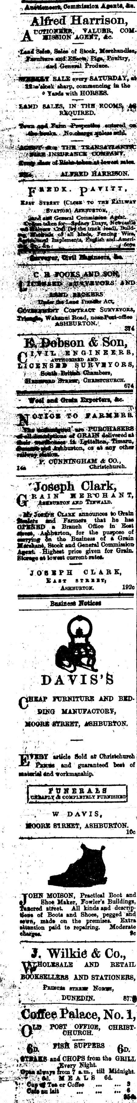 4ni*t on Aftatfl, Ae. COflOiniKß, VALUER, COM* MISSION AGENT, Ao. <Laad'Sa(ea, Slim of Stock, Merchandise, SALS eyery BATCBDAY^*! 4#;Wak)ak sharp. comiaondag M tho * Tarda with HORSES. SAND BAXES, IN THHRCOM& A 8: REQUIRED. \* r *girwn ■ -i Aw .IwwTw. JSo nhMSlf <V ‘ ffim> ahw fifßhhi trtiiniirl lrr- t - 4 - ALFRED JtAJKSSfOJX. pi SB X . p ATI*T, At**- BT*SKT (Cnees TO THlr fiiiLWiY : A- ~, {*l taMGeMral vCsrtMM*B««ra,** cat volts AND .: r- *> - • ; C<w?n*cr Susvkyors, Tlfcartay Wakanai Road, nea»Poa*-offi«o . ASHBURTON.'. * ' Bfi pAWUDvm w w**, R ; B;R », anSoaxsKD Aim Ji.l OSH S BS Y 0 RS, • ‘ So^^BritiikGlufflibeOT, -Xftaiaar, ■ OmuOTcmracH. 674 VMlaa* Orate ExpertarvAe. at' OTIOB TO f AESSR& ,l t>'tf AwiliWhifir* “-' PCBOHABKRB m» MANclai ■’EjttlJlOßj'EßlSfß Ashburton, oaatnny oftw U* Tt. CUNNINGHAM & 00., Christchurch. Joseph Clark, RAIN MERCHANT, Aaaatmros amo Tnrwiin. alt?; Olasx announces to Grain -BWltli Wad Farmer* that he has OttftßP - a Branch Office in' Beat Jfenah, lor the purpose of gei rjjiig ftn thie Business of 4 Grain Mbehani. Stodr and General Commission flgrnfi -Highest price given lor Grain. Storage tatavsat current ralea. JOBS PH CLARK, Baa* siaiir, Ahhbostov. 192 c BuiAeaft F«tk«i DAVIS’fe OHBAP FURNITURE AND BIDV DING MANUFACTORY, MOORS STREET, ABHBUBtON. EtIBY article Sold at Christchurch /• ftooia and guaranteed heat of MUttarlal 4nd workmanship, FUNERALS A counxTBLT ruMnsHM W DAVIS, Moors street, ashburYon. 16c Jk TTOHK MOISON, Practical Boot and if Shoe Maker, Fowler’s Buildings, Taaored street All kinds apd descnpleoa of Boots and Shoes, pegged .and sewn, made on the premises. Extra attention paid te repairing. Moderate eWgti. 9e I. Wilkie & Co., SIESOLESALS AND RETAIL BOOKSELLERS AND STATIONERS, if , . P&ncrte btkb» Nonas, ‘-■t DUNEDIN. ■ -ST# Coffee Palace, No.l, 0“ 8 ’ ohrißt ‘ ■li Vtsft SUPPERS ft* V and CHOPS from the GRILL ’ . JJverv Night f ’Mpta aStgava from 7 a.m., till Midnight. 3«tWetV*'Ad. V MEALS 64 ym*** or Coffee taulait 9 Kft