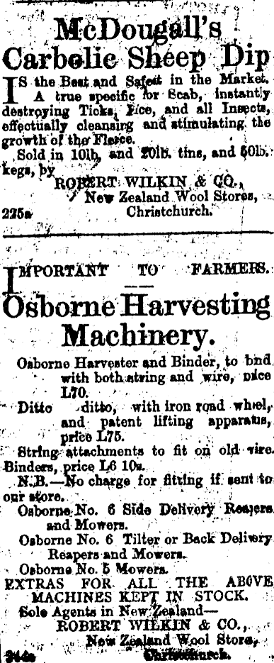 Vf*/{■ TJT CariwlW Sheep -Dip IS the Beat and SMpit in the Mark<& A true specific ror Scab, instantly destroying Tiokai and ill effectually cleansing and stimulating. the growth of ITlftttCQ. * i .Sold,ip and fOIB. tins, and fiOlb. - teg '’ <20.. •/ Ne» Zealand Wool Stores, a 236* Christchurch.’ f jrfPO»TMr TO r FARMERS. Oshome Haroosting Machinery. Osborne Harvester and Bmder, to hhd.j with bothatring and nice LTO. > ■ •* Ditto -ditto, with iron road whiel,and patent lifting apparatas,. price L 75. , • »' Btrlngr attachments to fit on oldrire. ■Binders, price L 6 IQit , , .. . H3.—-No chargefor fitting if. seni to our store. 3 OabornoNo. 6 Side Deliverjrßeajew/ and Mowers. 'y\ Oabome No. 6 Tiltsjr or Bade Delivery ' Reapers and Movera> • Osboma No. B Mowers. EXTRAS FOR .ALL THE ABOVE. MACHINES KEPT DjT STOCK. :1. f Sole Agents in NewSealand —
