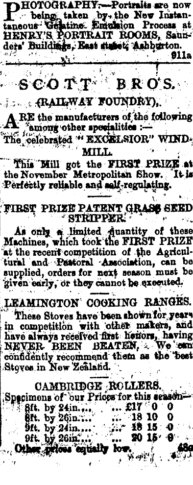 PHOTOGRAPHY;— -Portraits Be now | ' t *^ CQ J>y-*.tb® New Instantaneous- Gelatine.. jEntalMon Process at HBNBY’E PORTRAIT ROOMS, Sana-', ders’ Builda»i|BrEa«t rtt£ats 'Arhbtlrton. 911 a SCO fT' :t B R O‘S. ■ :.. OVUfcWiT TOtJMDRY),. A RE the manufacturers of/the fdlowiug . v among 'other specialities : The EXCELSIOR” WIND* ' ' ‘ MILL. -»■ ■ '■ fhla ’Mm got the FIRST PRIZE at the November Metropolitan Show. It- Ja Perfectly reliable and self,Tregulatlng. FIRST PRIZE PATENT ORASO SEED 1 As onh A. limited Quantity of these Machines, whichtOoktfcFlßST PRIZE at the recent competition of the Agricultural andPltttoral -Association, can be supplied, orders (or next season must be ‘given esirly,' dr they cannot be execute^ LEAMINGTON COOKING RANGES. ifheae Stoves have been shotoiloryeara hi competition with other mafcdrs, and have always recdlved first bettors, having ■ NEYRR BEEN BEATEN, X We ' wm’ confidently recommend them as tbo .Btgvea in New'ZeSlahd. CAMBRIDGE -ROLLERS., . scimens of'dur Priowforthis season—£Bft. by 24in;,:, . ‘... Elf : 0 0 Bit. by 26in.;..’ ... 18 10 0 §ft. by 24in....‘ ' :/« IB 15 4) 9ft. by ?6in.V.' SO If' 0 - luMi km