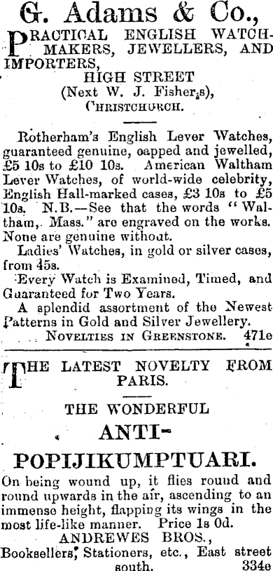 <sr. Adams &■ Co., PRACTICAL ENGLISH WATCHMAKERS, JEWELLERS, AND IMPORTERS, HIGH STREET (Next W. J. Fishery), ChBISTCH IiHCH. Rotherham’s English Lever Watches, guaranteed genuine, oapped and jewelled, £5 10s to £lO 10s. American Waltham Lever Watches, of world-wide celebrity, English Hall-marked cases, £3 10s to £5 10a. N.B. —See that the words “Waltham,. Maas.” are engraved on the works. None are genuine without. Ladies’ Watches, in gold or silver cases, from 455. : Every Watch is Examined, Timed, and Guaranteed for Two Tears, A splendid assortment of the Newestpatterns in Gold and Silver Jewellery. ... Novelties in Geeenstonk. 47 1 e rnHE LATEST NOVELTY FROM 1 PARIS. THE WONDERFUL ANTIPOPIJIKUMPTUARI. On being wound up, it flies round and round upwards in the air, to an immense height, flapping its wings in the most life-like manner. Price Is Od. ANDRE WES BROS., 'Booksellers* Stationers, etc., East street south. 334 e