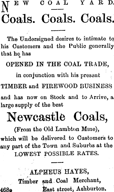 E W COAL YARD. Coals. Coals. Coals. The Undersigned desires to intimate to his Customers and the Public generally that he has OPENED IN THE COAL TRADE, in conjunction with his present TIMBER and FIREWOOD BUSINESS and has now on Stock and to Arrive, a large supply of the best Newcastle Coals, (From the Old Lambton Mine), which will be delivered to Customer's to any part of the Town and Suburbs at the LOWEST POSSIBLE RATES. ALPHEUS HAYES, Timber and Coal Merchant, 468 e East street, Ashburton.