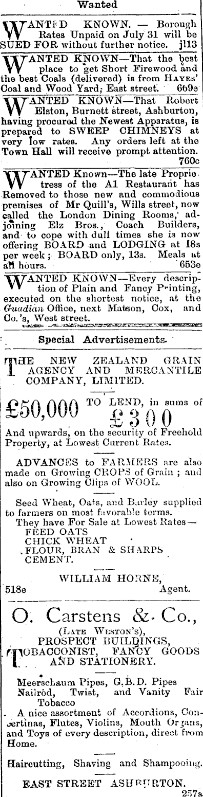 Wanted WANT I'D KNOWN. Borough Rates Unpaid on July 31 will be SUED FOR without further notice. jl!3 ANTED KNOWN—That the best place to get Short Firewood and the best Coals (delivered) is from Hayes’ Goal and Wood Yard; East street. 6b9e WANTED KNOWN—That Robert Elston, Burnett street, Ashburton, having procured the Newest Apparatus, is prepared to SWEEP CHIMNEYS at very low rates. Any orders left at the Town Hall will receive prompt attention. WANTED Known—The late Proprie tress of the A 1 Restaurant has Removed to those new and commodious premises of Mr Quill’s, Wills street, now called the London Dining Rooms,' adjoining Elz Bros., Coach Builders, and to cope with dull times she is now offering BOARD and LODGING at IBs per week ; BOARD only, 13s. Meals at aM hours. 653 e TXfANTED KNOWN—Every descript * » tion of Plain and Fancy P-inting, executed on the shortest notice, at the Guadian Office, next Matson, Cox, and Co. ’s, West street. : Special Advertisements. THE NEW ZEALAND GRAIN AGENCY AND MERCANTILE COMPANY, LIMITED. .fifr'A AAA LEND, in sums of £50,000 £3 OO And upwards, on the security of Freehold Property, at Lowest Current Rates. ADVANCES to FARMERS are also made on Growing CROPS of Grain ; and also on Growing Clips of WOOL. Seed Wheat, Oats, and Barley supplied to farmers on most favorable terms. They have For Sale at Lowest Rates FEED OATS CHICK WHEAT .FLOUR, BRAN & SHARPS CEMENT. WILLIAM HORNE, 518 e Agent. 0. Garstens &- Co., (Lath Weston’s), PROSPECT BUILDINGS, mOBACOONIST, FANCY GOODS 1. . AND STATIONERY. Meerschaum Pipes, G.B.D. Pipes Nailrod, Twist, and Vanity Fair Tobacco . A nice assortment of Accordions, Concertinas, Flutes, Violins, Mouth Or »ans, and Toys of every description, direct from Home. Haircutting, Shaving and Shampooing. EAST STREET ASHBURTON. 257 a