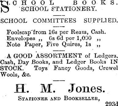 S.CHOOL BOOKS. SCHOOL STATIONERY. SCHOOL COMMITTEES SUPPLIED. Foolscap'from 16a per Ream, Cash. Envelopes ~ 6s 6d per 1,000 ~ Note Paper, Five Quires, Is „ A GOOD ASSORTMENT of Ledgers, Cash, Day Books, and Ledger Books IN STOCK. Toys Fancy Goods, Crewel Wools, &c. JEL M. Jones. Stationer and Bookseller, 293 d
