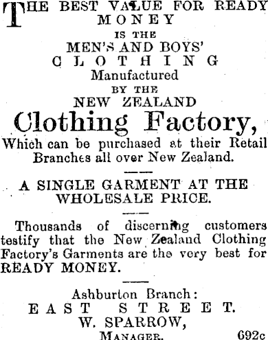 BEST VASjUE FOR READY MONEY IS THE MEN’S AND BOYS’ CLOTHING Manufactured BY THE NEW ZEALAND Clothing Factory, Whidh can be purchased at their Retail Branches all over New Zealand. . A SINGLE GARMENT AT THE WHOLESALE PRICE. Thousands of discerning customers testify that the New Zealand Clothing Factory’s Garments are the very best for READY MONEY. Ashburton Branch: EAST STREET. W. SPARROW, Manager. C92c