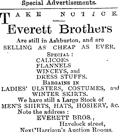 Special Advertisements. A K E NOTICE. Everett Brothers Are still in Ashburton, and are SELLING AS CHEAP AS EVER. Special : CALICOES FLANNELS WIFCEYS, and DRESS STUFFS. Bargains in LADIES’ ULSTERS, COSTUMES, and WINTER SKIRTS. We have still a Large Stock of MEN’S SHIRTS, HATS, HOSIERY, &c. Note the address : EVERETT BROS., Havelock street, Nexf'Harrison’s Auction Rooms.