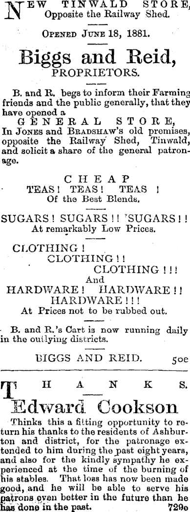 EW TIN WALD STORE, Opposite the Railway Shed. Opened June 18, 1881. Biggs and Eeid, PROPRIETORS. B. and R, begs to inform their Farming friends and the public generally, that they have opened a GENERAL STORE, In Jones and Bradshaw’s old premises, opposite the Railway Shed, Tinwald, and solicit a share of the general patronage. CHE A P TEAS 1 TEAS! TEAS I Of the Best Blends, SUGARS ! SUGARS !! ? SUGARS ! ! At remarkably Low Prices. CLOTHING ! CLOTHING 1! HARDWARE ! HARDWARE ! I HARDWARE ! ! ! At Prices not to be rubbed out. B. and R. ’s Cart is now running daily in the outlying districts. BIGGS AND REID. s oe 1 H A N K S. Edward Cookson Thinks this a fitting opportunity to return his thanks to the residents of Ashburton and district, for the patronage extended to him during the jmst eight years, and also for the kindly sympathy he experienced at the time of the burning of his stables. That loss has now been made good, and he will be able to serve his patrons pyen better in the future than he CLOTHING !!! And lias done in the past. 729 e