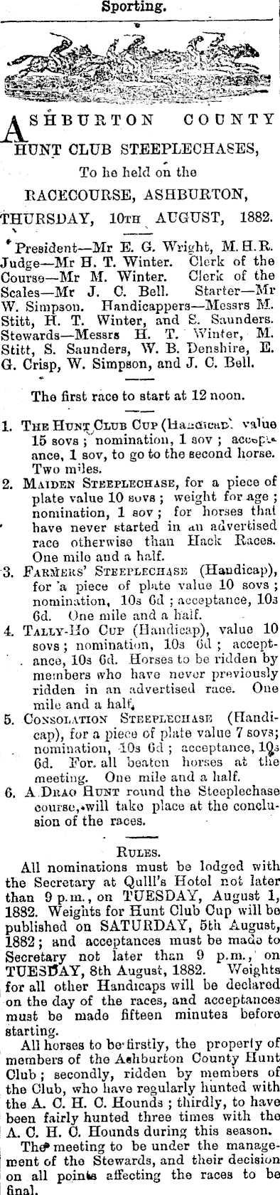 Sporting. ■■£.;■. .* ”~y- —T^rr*j v, j SHBURTON CODNTY "HUNT CLUB STEEPLECHASES, To ho held on the RACECOURSE, ASHBURTON, THURSDAY, lOxh AUGUST, 1882. \ '_ * President—Mr E. G. Wright, M.H.R. Judge—Mr H. T. Winter. Clerk of the Course—Mr M. Winter. Clerk of the Scales—Mr J. 0. Bell. Starter—Mr W. Simpson. Handicappers—Messrs M. Stitt, H. T. Winter, and S. Saunders. Stewards —Messrs H. T. Winter, M. Stitt, S. Saunders, W. B. Denshire, E. G. Crisp, W. Simpson, and J. C. Bell. The first race to start at 12 noon. 1. The Cup (Hanaican. value 15 sovs ; nomination, 1 aov ; accopi* ance, 1 aov, to go to the second horse. Two miles. 2. Maiden Steeplechase, for a piece of plate value 10 sovs ; weight for age ; nomination, 1 aov ; for horses that * have never started in an advertised race otherwise than Hack Races. One mile and a half. 3. Farmer s’ Steeplechase (Handicap), for ’a piece of plate value 10 sovs ; nomination, 10s Gd ; acceptance, 10s 6d. One mile and a half. 4. Tally-Ho Cup (Handicap), value 10 sovs; nomination, 10s Gd ; accept- . ance, 10s Cd. Horses to be ridden by members who have never previously ridden in an advertised race. One mile and a half 4 5. Consolation Steeplechase (Handicap), for a piece of plate value 7 sovs; nomination, 10s Gd ; acceptance, 6d. For. all beaten horses at the meeting. One mile and a half. 6. A.Drao Hunt round the Steeplechase course,»will take place at the conclusion of the races. Rules. All nominations must be lodged with the Secretary at Quill’s Hotel not later than 9 p.m., on TUESDAY, August 1, 1882. Weights for Hunt Club Cup will be published on SATURDAY, stu August, 1882 ; and acceptances must be made to Secretary not later than 9 p.m., on TUESDAY, Bth August, 1882. Weights for all other Handicaps will be declared on the day of the races, and acceptances must be made fifteen minutes before starting. All horses to be-firstly, the properly of members of the Ashburton County Hunt Club; secondly, ridden by members of the Club, who have regularly hunted with the A. O. H. 0. Hounds ; thirdly, to have been fairly hunted three times with the A. 0. H. 0. Hounds during this season. Th# meeting to be under the management of the Stewards, and their decision on all points affecting the races to be final.