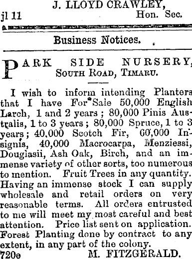 J. LLOYD CRAWLEY, jUI Hon. Sec, J*TTOTWiIWVBH Business Notices. , PARK SIDE NURSERY, South Road, Timaed. I wish to inform intending Planters that I have For"Saie 50,000 English Larch, 1 and 2 years ; 80,000 Pinis Australia, 1 to 3 years ; 80,000 Spruce, 1 to 3 years; 40,000 Scotch Fir, 00,000 Insignia, 40,000 Macrocarpa, Menziessi, Douglasii, Ash Oak, Birch, and an immense variety of other sorts, too numerous to mention. Fruit Trees in any quantity. Having an immense stock I can supply wholesale and retail orders on very reasonable terms. All orders entrusted to me will meet my,most careful and best attention. Price list sent on application. Forest Planting done by contract to any extent, in any part of the colony. 720 e M. FITZGERALD.