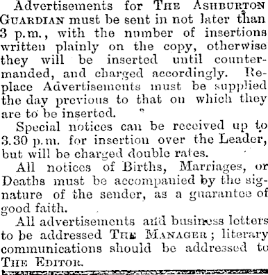 Advertisements for The Ashburton Guardian must be sent in not later than 3 p.m., with the number of insertions written plainly on the copy, otherwise they will be inserted until countermanded, and charged accordingly. Replace Advertisements must be supplied the day previous to that on which they are to' be inserted. ” Special notices can be received up to 3.30 p.m. for insertion over the Leader, but will be charged double rates. All notices of Births, Marriages, or Deaths must be accompanied by the signature of the sender, as a guarantee of good faith. All advertisements aild business letters to be addressed The Manager ; literary communications should bo addressed to The Editor.