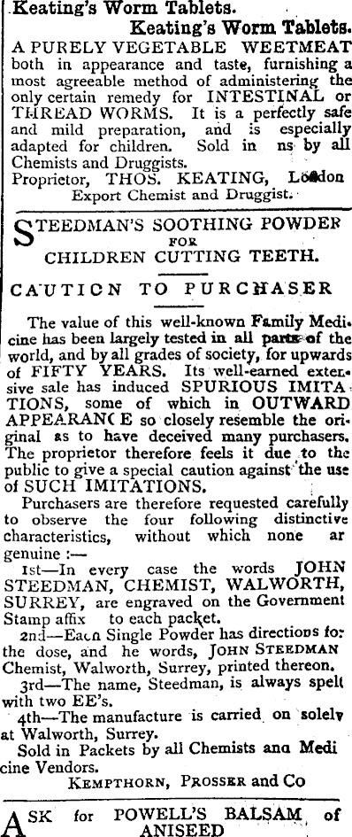 Keating’s Worm Tablets. Keating’s Worm Tablets. A PURELY VEGETABLE WEETMEAT both in appearance and taste, furnishing a most agreeable method of administering the only certain remedy for INTESTINAL or THREAD WORMS. It is a perfectly safe and mild preparation, and is especially adapted for children. Sold in ns by all Chemists and Druggists. Proprietor, THOS. KEATING, _ London Export Chemist and Druggist; TEEDMAN’S SOOTHING POWDER CHILDREN CUTTING TEETH. CAUTION TO PURCHASER The value of this well-known Family Medi. cine has been largely tested in all parta of the world, and by all grades of society, for upwards of FIFTY YEARS. Its well-earned extensive sale has induced SPURIOUS IMITATIONS, some of which in OUTWARD APPEARANCE so closely resemble the original as to have deceived many purchasers. The proprietor therefore feels it duetto the public to give a special caution against 'the use of SUCH IMITATIONS. Purchasers are therefore requested carefully to observe the four following distinctive characteristics, without which none ar genuine : Ist—ln every case the words JOHN STEEDMAN, CHEMIST, WALWORTH, SURREY, are engraved on the Government Stamp affix to each pacl^et. 2nd—Eatn Single Powder has directions for the dose, and he words, John Steedman Chemist, Walworth, Surrey, printed thereon. 3rd —The name, Steedman, is always spelt with two EE’s. 4th —The manufacture is carried on solely at Walworth, Surrey. Sold in Packets by all Chemists ana Medi cine Vendors. Kempthorn, Prosser and Co SK for POWELL’S BALSAM of ANISEED