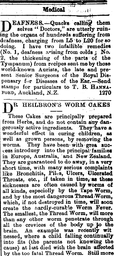 Medical - - DEAFNES S.—Quadra oallihg them selves “ Doctors,” are utterly paining the organs of hundreds suffering from deafness, charging from L 5 'to L2O for so doing. I have two infallible' remedies (No. 1, deafness .vising from colds j No. 2, the thickening of the parts of the Tympanum) from recipes sent me by those world-known Aurists, the late and pre* sent Senior Surgeons of the Royal Dispensary for Diseases of the Ear.—Send stamps for particulars to T. B. Hannafokd, Auckland, N.Z. 1270 JQR HEILBRON’S WORM OAKES These Cakes are principally prepared from Herbs, and do not contain any dangerously active ingredients. They have a wonderful effect in curing children, as well as grown persons, by removing the worms. They have been* with>gtea success introduey into the principal'families in Europe, Australia, and New Zealand. They are guaranteed to do a Way, in a very short time, with many serious complaints like Bronchitis, Files, Dicers, Ulcerated Throats, etc., if taken in time,as these sicknesses are often caused by worms of all kinds, espeoiolly by the Tape Worm, and by the most dangerous Thread iWorm, which, if not destroyed in time, will soon create the nardly-curafcle Worm Fever. The smallest, the Thread Worm, will more than any other worm penetrate through all the crevices of the body up jo the brain. An example was recently wit nessed, where a child falling continually into fits (the parents not knowing the cause) at last died with the brain-affected by the too fatal Thread Worm. Still more