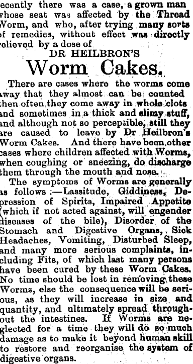 recently there was a case, a grown man tvhoae seat wai affected by the Thread Worm, and who, after trying many aorta remedies, without effect was directly relieved by a dose of . DR HEILBRON’S Worm Cakes. There are cases where the worms come away that; they almost can be i counted then often,they come away in wholeiclots and sometimes in,a thick and slimy stuff, and although not so perceptible^Still they are caused to leave by Dr Heilbron’s Worm Cakes. And there have been.other cases where children affected with-Worms, when coughing or sneezing, do discharge them through the mouth arid nose. ;. The symptoms of Worms are; generally as follows :—Lassitude, Giddiness, Depression of Spirits, Impaired Appetite (which if not acted against, will engender diseases of the bile), Disorder of the Stomach and Digestive Organs,, Sick Headaches, Vomiting, Disturbed Sleep, and many more serious complaints, including Fits, of which last many persons have been cured by these Worm Oakes. No time should be lost in removing,these Worms, else the consequence will be serious, as they will increase in size, and quantity, and ultimately spread throughout the intestines. If Worms are neglected for a time - they will do so'.much damage as to make it beyond human skill to restore and reorganise, the; system of digestive organs.