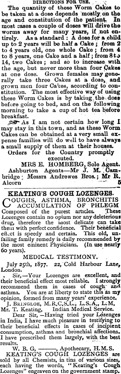 DIRECTIONS FOB USB. • s; The quantity of these Worm Oakes to be taken at a dose depends mostly on the age and constitution of. the patient In most cases a couple of doses will drive the worms away for many years, if not en* I tirely. As a standard : A. dose for a,child up to 2 years will be half a Oake; from 2 to 4 years old, one whole Oake ; from 4 to 8 years, one Cake and a half; from Bto 14, two Cakes; and so to increase, with the age, but never more than four pakes at one dose. Grown females may gene* rally take three Cakes at a dose, and grown men four Cakes, according to con* stitution. The most effective way of using these Worm Cakes is by taking, the-doss before going to bed, and on the following morning to take a cup of hot tea before breakfast. I am not certain how long 1 may stay in this town, and as these Worm Cakes can be obtained at a very small ex* pense families will do well to have always a small supply of them at their houses. Orders for the Country promptly executed. MRS E. HOMBERG, Sole Agent. Ashburton Agents—Mr J. M. Cam* bridge; Messrs Andrewes Bros.; Mr R. Alcorn 6 KEATING’S COUGH LOZENGES. COUGHS, ASTHMA, BRONCHITIS ACCUMULATION OF PHLEGM Composed of the purest articles. These Lozenges contain no opium nor any deleterious drug, therefore the most delicate can take them with perfect confidence. Their beneficial eftwct is speedy and certain. This old, un> failing family remedy is daily recommended by the most eminent Physicians. (In use nearly 6o years). MEDICAL TESTIMONY. July 25th, 1877. 22, Cold Harbour Lane, London. . Sir, —Your Lozenges are excellent, and their beneficial effect most reliable. I strongly recommend them in cases of cough' and asthma. You are at liberty to state this Us my opinion, formed from many years’ experience. J. Bringloe, M.R.C.S.L., L.S.A., L;M, Mr, T. Keating, Indian Medical Service. Dear Sir, —Having tried your Lozenges in India, I have much pleasure in testifying to their beneficial effects in cases_ of incipient consumption, asthma and bronchial affections. I have prescribed them largely, with the best results. ‘ W. B. G, , Apothecary, H.M.S. KEATING’S COUGH LOZENGES are sold by all Chemists, in tins of various sizes, each having the words, “Keating’s Cough Lozenges” engraven on the government stamp.