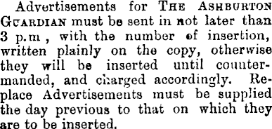 Advertisements for The Ashburton Guardian must be sent in not later than 3 p.tu , with the number ®f insertion, written plainly on the copy, otherwise they will be inserted until countermanded, and charged accordingly. Replace Advertisements must be supplied the day previous to that on which they are to be inserted.