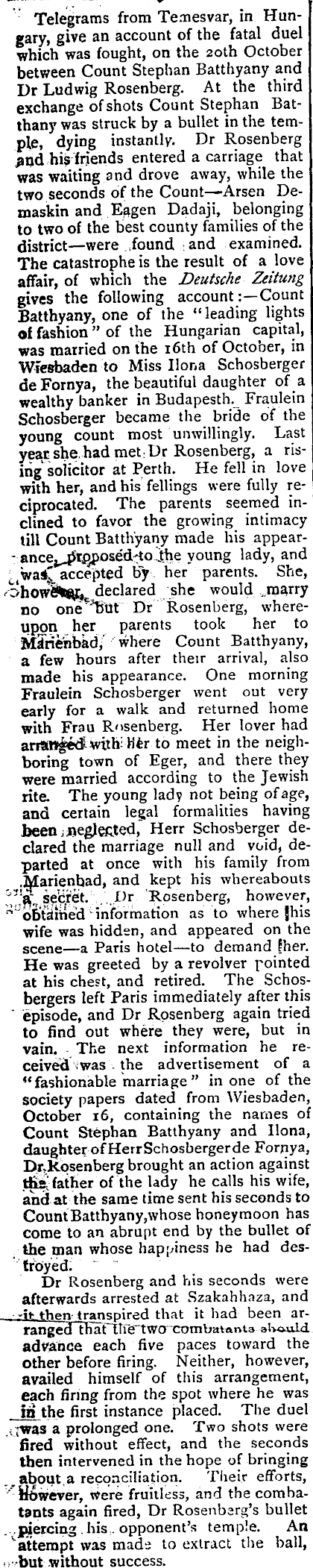 -—■ ■ - w Telegrams from Temesvar, in Hungary, give an account of the fatal duel which was fought, on the 20th October between Count Stephan Batthyany and Dr Ludwig Rosenberg. At the third exchange of shots Count Stephan Batthany was struck by a bullet in the temple, dying instantly. Dr Rosenberg Jijd his friends entered a carriage that was waiting and drove away, while the two seconds of the Count—Arsen Demaskin and Eagen Dadaji, belonging to two of the best county families of the district —were ..found and examined. The catastrophe is the result of a love affair, of which the Deutsche Zeitung gives the following account Count Batthyany, one of the “ leading lights of fashion ” of the Hungarian capital, was married on the 16th of October, in Wiesbaden to Miss Ilona Schosberger deFornya, the beautiful daughter of a wealthy banker in Budapesth. Fraulein Schosberger became the bride of the young count most unwillingly. Last year she, had met. Dr Rosenberg, a rising" solicitor at Perth. He fell in love with her, and his fellings were fully reciprocated. The parents seemed inclined to favor the growing intimacy till Count Batthyany made his appear- - young lady, and Ci waS' accepted by her parents. She, declared she would . marry no one ’but Dr Rosenberg, whereupon her parents took her to MsTriehbad, where Count Batthyany, a few hours after their arrival, also made his appearance. One morning Fraulein Schosberger went out very early for a walk and returned home with Frau Rosenberg. Her lover had anang&fwith; Htr to meet in the neighboring town of Eger, and there they were married according to the Jewish rite. The young lady not being of age, and certain legal formalities having been .neglected, Herr Schosberger declared the marriage null and void, departed at once with his family from .Marienbad, and kept his whereabouts .’..P r - Rosenberg, however, "oSSified '• information as to where jhis wife was hidden, and appeared on the scene—a Paris hotel—to demand Pher. He was greeted by a revolver pointed at his chest, and retired. The Schosbergers left Paris immediately after this ' episode, and Dr Rosenberg again tried to find out where they were, but in vain. The next information he received «was . the advertisement of a “fashionable marriage ” in one of the society papers dated from Wiesbaden, October 16, containing the names of Count Stephan Batthyany and Ilona, daughter of HerrSchosbergerde Fornya, Dr,Kpsenberg brought an action against father of the lady he calls his wife, and at the same time sent his seconds to Count Batthyany, whose honeymoon has come to an abrupt end by the bullet of the man whose happiness he had destroyed: Dr Rosenberg and his seconds were afterwards arrested at Szakahhaza, and _ - -It then transpired that it had been arrangedTharitfertwa combaiania alvauld advance each five paces toward the other before firing. Neither, however, availed himself of this arrangement, each firing from the spot where he was In the first instance placed. The duel j|was a prolonged one. Two shots were fired without effect, and the seconds then intervened in the hope of bringing about. a reconciliation. Their efforts, " However, Were fruitless, and the combatants again fired, Dr Rosenberg’s bullet ... piercing. his,, opponent’s temple. An ''attempt was made to extract the ball, !)• butwithout success.
