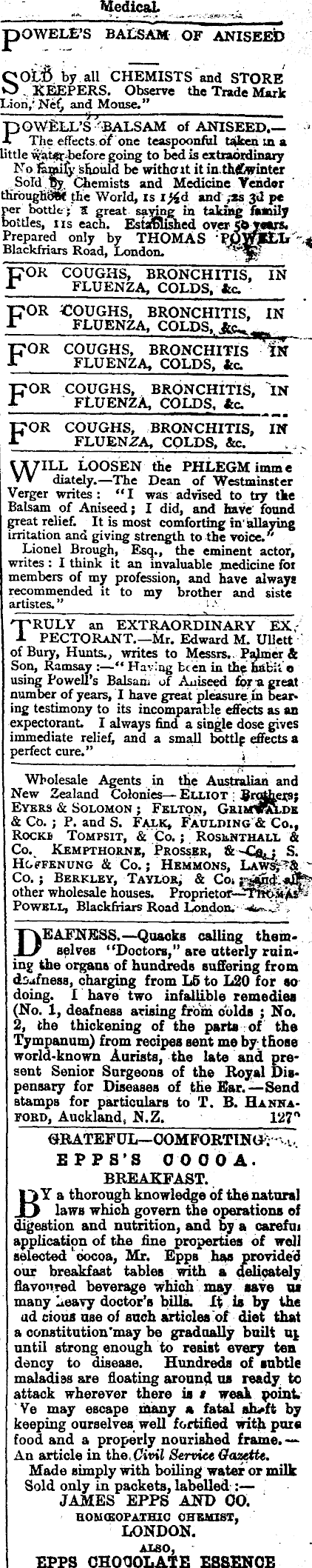 MedicaL P OWELE’S BALSAM OF ANISEED SOt®. by all CHEMISTS and STORE .. KEEPERS. Observe the Trade Mark Lion,' Nef. and Mouse.” POWELL’S - BALSAM of ANISEED.— ‘ The effects. 6t one teaspoonful taken in a little going to bed is extraordinary No&mifysEould be without it inth£winter _Sord .% Chemists and Medicine Vender througbdftt the World, is i>£d and ,*s 3d pe per bottle ; R great saving in talcing family bottles, us each. Established over 50 years. Prepared only by THOMAS : POjntt.L ,4. Blackfriars Road, London. . WILL LOOSEN the PHLEGM imme diately.—The Dean of Westminster Verger writes: “I was advised to try the Balsam of Aniseed; I did, and have' found great relief. It is most comforting in' allaying irritation and giving strength to the voice." Lionel Brough, Esq., the eminent actor, writes : I think it an invaluable medicine foi members of my profession, and have always recommended it to my brother and siste artistes.” i-' , Truly an extraordinary ex/ PECTORaNT.—Mr. Edward M. UUett of Bury, Hunts., writes to Messrs.. Palmer & Son, Ramsay : —“ Having been in the habit o using Powell’s Balsam of Aniseed for a great number of years, I have great pleasure in bearing testimony to its incomparable effects as an expectorant. I always find a single dose gives immediate relief, and a small bottlf effects a perfect cure.” j ' • •. Wholesale Agents in the Australian and New Zealand Colonies—Elliot ; Brothers; Byers & Solomon ; Felton, GeiutoLdb & Co.; P. and S. Falk, Faulding & Co., Rocks Tompsit, & Co.; Rosenthall & Co._ Kempthornk, Prosser, & S. Hgpfenung & Co.; Hbumons, Co.; Berkley, Taylor; & Co*gaand.ajSf' other wholesale houses. Proprietor—iTnoMissFowbll, Blackfriars Road \ DEAFNESS. —Quacks calling them* selves “Doctors,” are utterly ruin* ing the organa of hundreds Buffering from deafness, charging from L 6 to L2O for so doing. 1 have two infallible remedies (No. 1, deafness arising from colds ; No. 2, the thickening of the parts of the Tympanum) from recipes sent me by : those world-known Aurists, the late and present Senior Surgeons of the Royal Dispensary for Diseases of the Ear.—Send stamps for particulars to T. B. Hannaford, Auckland, N.Z. 127° GRATEFUL—COMFORTING; ... EPPS’S COCOA. BREAKFAST. BT a thorough knowledge of the natural laws which govern the operations el digestion and nutrition, and by a carefui application of the fine properties of well selected cocoa, Mr. Epps has provided our breakfast tables with a delicately flavoured beverage which may save nr many heavy doctor’s bills. It is by the ud cions use of such articles ot diet that a constitntion'may be gradually built uj until strong enough to resist every tea dency to disease. Hundreds of subtle maladies are floating around ns ready to attack wherever there is t weak point. Ve may escape many a fatal sh#ft by keeping ourselves/ well fortified with pore food and a properly nourished frame. An article in the. Civil Service Gazette. Made simply with boiling water or milk Sold only in packets, labelled : JAMES EPPS AND 00. HOMOEOPATHIC CHEMIST, LONDON. ALSO, EPPS CHOCOLATE ESSENCE