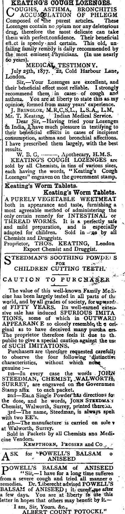 • KEATING’S COUGH LOZENGES. COUGHS, ASTHMA, BRONCHITIS ACCUMULATION OF PHLEGM I Composed of nhe purest articles. These : Lozenges contain no .opium nor any deleterious drug, therefore the most delicate can take them with perfect^confidence. Their beneficial efkct is speedy - and certain. This old, unfailing family remedy is daily recommended by fhe. most eminent. Physicians. (In use nearly ■ 60 years). ' MEDICfI%TESTIMONY. July 25th, 1877. '22, Cold Harbour Lane, London. Sir, —Your Lozenges are excellent, and their beneficial effect most reliable. I strongly - recommend them, ■in cases- -of cough and asthma, You are At liberty to state this as my ■ opinion, formed from many years’ experience. J. Bringloe,- M.R.C.S.L., L.S.A., L.M. 1 Mr. T. Keating,, Indian Medical Service. ’ Dear Sir, —Having tried your Lozenges Ju India, siave much pleasure in testifying to 1 their beneficial effects in cases of incipient I have prescribed them largely, with the best i results. \V. B. G, , Apothecary, H.M.S. , KEATING’S COUGH LOZENGES are sold by all Chemists, in tins of various sizes, each having the words, “Keating’s Cough Lozenges” engraven on the government stamp. Keating’s Worm Tablets. Keating’s Worm Tablets. A PURELY VEGETABLE WEETMEAT both in appearance and taste, furnishing a most agreeable method of administering the only certain remedy for INTESTINAL or THREAD WORMS. It is a perfectly safe v and mild preparation, and is especially adapted for children. Sold in - jjs by all Chemists and Druggists. Proprietor, THOS. KEATING, London Export Chemist and Druggist. STEEDMAN’S SOOTHING POWDEi S FOR CHILDREN CUTTING TEETH. CAUTION TO PURCHA^KR -t " , The value of this well-known .Family Medi. cine has been largely tested in all parts of the world, and by all grades of society, for upwards of FIFTY YEARS. Its well-earned exte&. sive sale has induced SPURIOUS IMITA TIONS, some of which in OUTWARD APPEARANf E so closely tk t original as to have deceived many puroha ersThe proprietor therefore feels it due to th. public to give a special caution-against the nst of SUCH IMITATIONS. * Purchasers are therefore requested careful!} to observe the four following Vdistinctivt characteristics, without which nobq genuine : Ist—ln every case the words - JOHN STEEDMAN, CHEMIST, JWALWORTHj SURREY, are engraved on the Governmen Stamp affix, to each packet. 2nd—Eacn Single PowdefiAs directions foI the dose, and he words, John Steed MA;r Chemist, Walworth, Surrey, printed therein. 3rd —The name, Steedman, is always spelt with two EE’s, 4th —The manufacture' is carried on sole v at Walworth, Surrey. Sold in Packets by all Chemists ana Medi* cine Vendors. Kkmpthorn, Prosser and Co . - ASK for '-POWELL’S BALSAM o * ANISEED POWELL’S BALSAM of ANISEED “ Sir, —I have for a long time suffereo from a severe cough and tried all manner o remedies. Dr. Liberecht advised POWELL’S BALSAM of ANISEED ; after a few days. You are at lib«frty w use this letter in hopes that others may benefit by It.— I am. Sir, Yours. &c., ALBERT COUNT POTOCKI.”