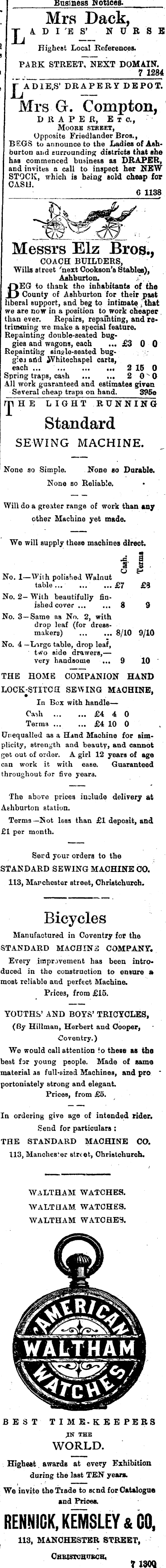 Easiness NoticesMrs Back, 4 D I 'E S’ N 0 E S B Highest Local References. PARK STREET, NEXT DOMAIN. i _____ 7 1284 3 DRAPERY DEPOT. Mrs GK Compton, ’ DRAP ER, E t c., : , Moore street, , Opposite Friedlander Bros., BEGS to announce to the Ladies of Ash- , burton and surrounding districts that she has commenced business as DRAPER, and invites a call to inspect her NEW STOCK, which is being sold cheap for CASH. 6 1138 Messrs Elz Bros. COACH BUILDERS, Wills street 'next Cookson’a Stables), Ashburton. BEG to thank the inhabitants of the County of Ashburton for their past liberal support, and beg to intimate ■ that we are now in a position to work cheaper, than ever. Repairs, repainting, and re* trimming we make a special feature. Repainting double-seated buggies and wagons, each ... £3 0 0 Repaintifag sins la-seated buggiej and Whitechapel carts, each ... 2 16 0 Spring traps, cash 2 0 0 All work guaranteed and estimates given Several cheap traps on hand. 396 e fjp H E LIGHT RUNNING Standard SEWING MACHINE. None so Simple. None so Durable. None so Reliable. Will do a greater range of work than any other Machine yet made. We will supply these machines direct. No. I—With polished Walnut table... ... ... £7 £9 No. 2 With beautifully finished cover 8 9 No. 3—Same as No. 2, with drop leaf (for dressmakers) 8/10 9/10 No. 4 —Large table, drop leaf, ■ two side drawers, — very handsome ... 9 10 THE HOME COMPANION HAND LOCK-STITCH SEWING MACHINE, In Box with handle— Cash £4 4 0 Terms ... ... £4 10 0 Unequalled as a Hand Machine for simplicity, strength and beauty, and cannot get out of order. A girl 12 years of age can work it with ease. Guaranteed throughout for five years. The above prices include delivery at Ashburton station. Terms—Not less than £1 deposit, and £1 per month. Send your orders to the STANDARD SEWING MACHINE CO. 113, Manchester street, Christchurch. Bicycles Manufactured in Coventry for the STANDARD MAOHIN3 COMPANY. Every improvement has been introduced in the construction to ensure a most reliable and perfect Machine. Prices, from £ls. YOUTHS’ AND BOYS’ TRICYCLES, (By Hillman, Herbert and Cooper, Coventry.) We would call attention to these as the best for young people. Made of same material as full-sized Machines, and pro portoniately strong and elegant. Prices, from £5. In ordering give age of intended rider. Send for particulars: THE STANDARD MACHINE CO. 113, Manchester street, Christchurch. WALTHAM WATCHES. WALTHAM WATCHES. WALTHAM WATCHES. WALTHAM BEST TIME-KEEPERS ,IN THE WORLD. Highest. awards at every Exhibition during the last TEN years. We invite the Trade to send for Catalogue and Prices. RENNIGK, KEMSLEY & CO, 113, MANCHESTER STREET, Ohristchtoch, 7 im