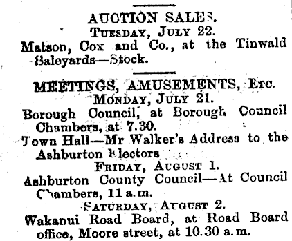 AUCTION SALE?. ’ Tuesday, July 22. Matson, Cox and Co., at the Tinwald - Baleyards—Stock. MEISTINOS; AMUSEMENTS, - Etc. ■‘MdNbAYj July 21. Borough Council,* at Borough Council Chambers, ,at 7-30. 1 Town Hall—Mr Walker’s Address to the Ashburton It lectors Friday, August 1. Ashburton County Council—At Council Chambers, 11a.m. Saturday, August 2. Wakanui Road Board, at Road Board office, Moore street, at 10.30 a. m.