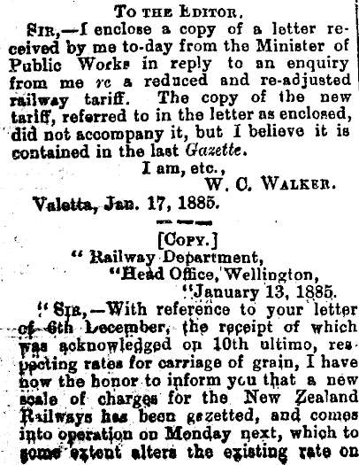 To the Editor. Plß,—--I enclose a copy of a letter received by me to-day from the Minister of Public Works in reply to an enquiry from me re a reduced and re-adjusted nulwsy tariff. The copy of the new tariff, referred to in the letter as enclosed, ' did not accompany it, but I believe it is contained in the last Gazette, lam, etc., W. 0. Walker. Valetta, Jan. 17,1885. [Copy.] “ Railway Department, “Head Office,'Wellington, “January 13. I§Bs. i* Sir, —With reference to your'letter of"otn Lecepiber, (he rpppipt of which prja ‘i*oknowledgpd op 10th ultimo, res upding rate* for carriage of grain, I have nqw the honor to ipform you that a new . scale of charges for the New Zealand It’ulWaya bw been gesetted, and comes iftto operation on Monday qext, which to ponff alters the existing i»te on