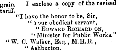 grain. I enclose a copy of the revised tariff. “I have the honor to be, Sir, “ xour obedient servant, “ Edward Richard on, *• Minister for Public Works.” “ W. C. Walker, Esq., M.H.R., “ Ashburton.