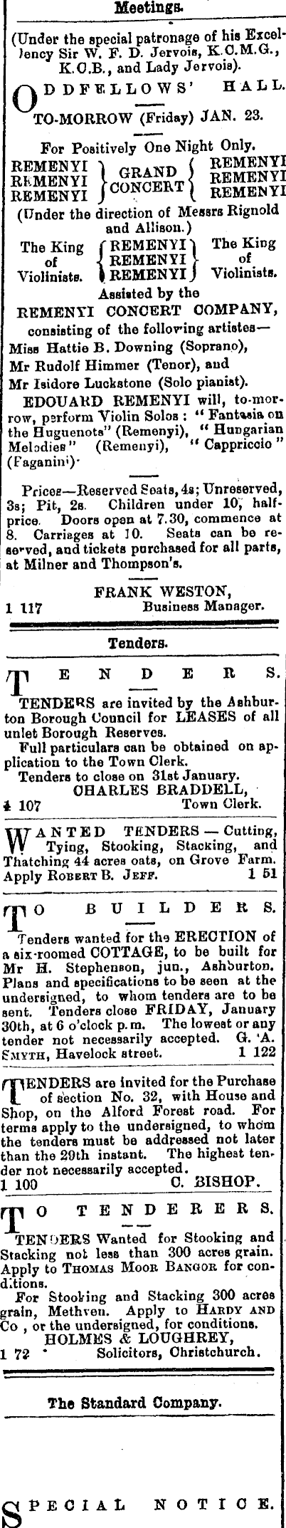 Meetings. (Under the special patronage of his Excellency Sir W. F. D. Jervois, K.0.M.G., K. 0.8., and Lady Jervois). HALL. (Friday) JAN. 23. For Positively One Night Only. REMENYI 'I rjp.xTD ( R^MENYI REMENYI LoNOERT) REMENYI REMENYI (Under the direction of Messrs Rignold and Allison.) The King ( REMENYII The King of ■! REMENYI } of Violinists. | REMENYI ) Violinists. Assisted by the REMENYI CONCERT COMPANY, consisting of the following artistes— Miss Hattie B. Downing (Soprano), Mr Rudolf Himmer (Tenor), and Mr Isidore Luokstone (Solo pianist). EDOUARD REMENYI will, to-mor-row, pstform Violin Solos : “ Fantwia on the Huguenots” (Remenyi), “ Hungarian Melodies " (Remenyi), “ Cappricoio ’’, (Paganini)Prices—Reserved Seats, 4s; Unreserved, 3s; Pit, 2s. Children under 10, halfprice. Doors open at 7.30, commence at 8. Carriages at 10. Seats can bo reserved, and tickets purchased for all parts, at Milner and Thompson’s. FRANK WESTON, 1 H 7 Business Manager. Tenders. /jl E N D E R S. TENDERS are invited by the Ashburton Borough Council for LEASES of all unlet Borough Reserves. Full particulars can be obtained on application to the Town Clerk. Tenders to close on 31st January. CHARLES BRADDELL, i 107 Town Clerk. WANTED TENDERS Cutting, Tying, Stocking, Stacking, and Thatching 44 acres oats, on Grove Farm. Apply Robert B. Jeff. 1 61 rpo BUILDERS. Tenders wanted for the ERECTION of a six-roomed COTTAGE, to be built for Mr H. Stephenson, jun., Ashburton. Plans and specifications to bo seen at the undersigned, to whom tenders are to be sent. Tenders close FRIDAY, January 30tb, at 6 o’clock p. m. The lowest or any tender not necessarily accepted. G. *A. Smyth, Havelock street. 1 122 TENDERS are invited for the Purchase of section No. 32, with House and shop, on the Alford Forest road. For erms apply to the undersigned, to wbo'm ho tenders must be addressed not later han the 29th instant. The highest tenler not necessarily accepted, . 100 o. BISHOP. rpo TENDERERS. TENDERS Wanted for Stocking and Stacking not less than 300 acres grain. Apply to Thomas Moor Bangor for conditions. For Stocking and Stacking 300 acres grain, Methven. Apply to Hardy and Co , or the undersigned, for conditions. HOLMES & LOUGHREY, 1 7? * Solicitors, Christchurch. The Standard Company. gPEOIAL NOTICE.