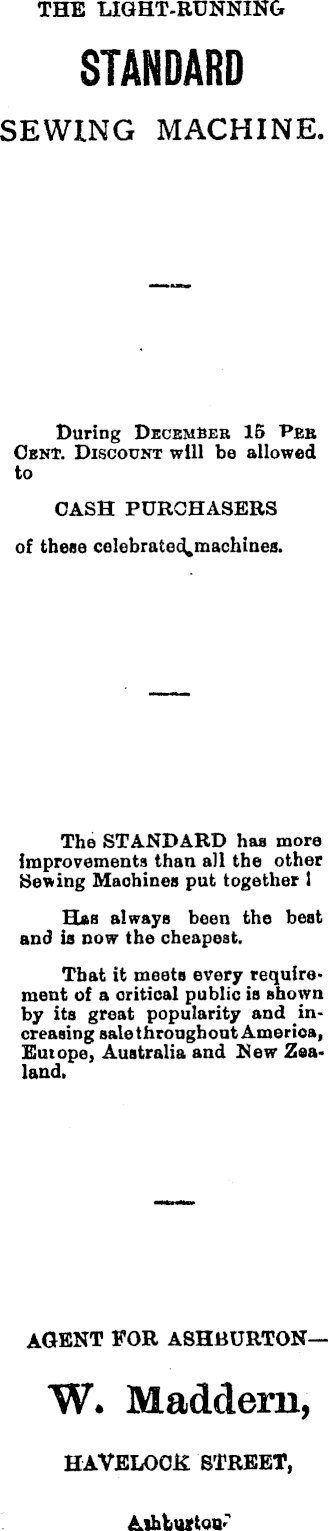 THE LIGHT-RUNNING STANDARD SEWING MACHINE. During December 15 Peb Cent. Discount will be allowed to CASH PURCHASERS of these celebratec^machinea. The STANDARD has more improvements than all the other Sewing Machines put together i Has always been the beat and is now the cheapest. That it meets every requirement of a critical public is shown by its great popularity and increasing sale throughout America, Eutope, Australia and New Zealand. AGENT FOR ASHBURTON— W* Maddem, HAVELOCK; STREET, Aihturton"