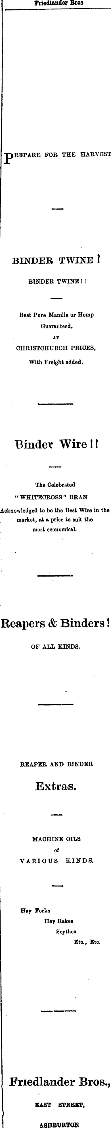 Friedlander Bros. JpRI'PARE FOR THE HARVEST. BINDER TWINE I BINDER TWINE 11 Beat Pure Manilla or Hemp Guaranteed, AT CHRISTCHURCH PRICES, With Freight added. I Binder Wire!! The Celebrated “ WHITEOROSS ” BRAN Acknowledged to be the Beat Wire in the market, at a price to auit the moat economical. Reapers & Binders! OP ALL KINDS. REAPER AND BINDER Extras. MACHINE OILS of VARIOUS KINDS. Hay Forks Hay Rakea Scythes Etc., Etc. Friedlander Bros., EAST STREET, ASHBURTON