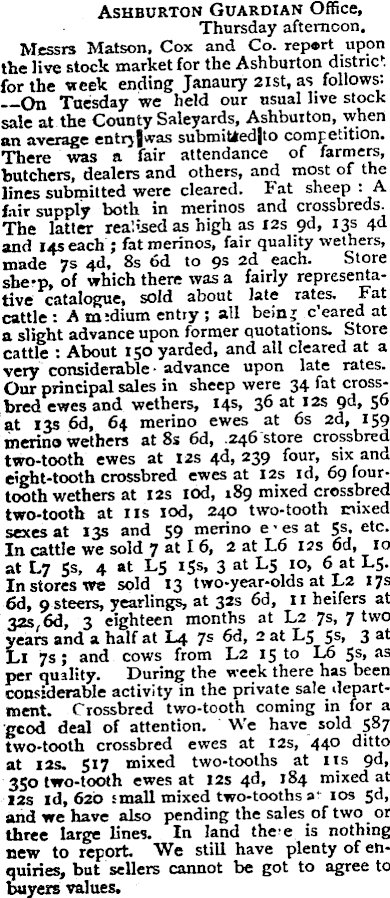 Ashburton Guardian Office, Thursday afternoon. Messrs Matson, Cox and Co. report upon the live stock market for the Ashburton district for the week ending Janaury 2ist, as follows: On Tuesday we held our usual live stock sale at the County Saleyards, Ashburton, when an average entrj|was submitted|to competition. There was a fair attendance of fanners, butchers, dealers and others, and most of the lines submitted were cleared. Fat sheep : A fair supply both in merinos and crossbreds. The latter realised as high as 12s 9d, 13s 4d and 14s each ; fat merinos, fair quality wethers, made 7s 4d, 8s 6d to 9s 2d each. Store she-p, of which there was a fairly representative catalogue, sold about late rates. Fat cattle : A m:dium entry ; all bein' c’eared at a slight advance upon former quotations. Store cattle ; About 150 yarded, and all cleared at a very considerable • advance upon late rates. Our principal sales in sheep were 34 fat crossbred ewes and wethers, 14 s . 3® a t 125 9d» S® at 13s 6d, 64 merino ewes at 6s 2d, 159 merino wethers at 8s 6d, .246 store crossbred two-tooth ewes at 12s 46, 239 four, six and eight-tooth crossbred ewes at 12s id, 69 fourtooth wethers at 12s lod, 189 mixed crossbred two-tooth at ns lod, 240 two-tooth mixed sexes at 13s and 59 merino e’ es at ss. etc. In cattle we sold 7at 16, 2at L 6 12s 6d, 10 at L 7 Ss, 4 at LS 15s, 3 at L 5 10, 6at Ls. In stores we sold 13 two-year-olds at L2 17s 6d, 9 steers, yearlings, at 32s 6d, 11 heifers at 325, 6d, 3 eighteen months at L2 7 s . 7 * wo years and a half at L 4 7 s ®d, 2at L 5 5 S > 3 a *- Li 7s; and cows from L2 15 to L 6 5 S > as per quality. During the week there has been considerable activity in the private sale department. Crossbred two-tooth coming in for a good deal of attention. We have sold 587 two-tooth crossbred ewes at 12s, 440 ditto at 12s. 517 mixed two-tooths at lis 9d, 350 two-tooth ewes at 12546, 184 mixed at 12s id, 62b small mixed two-tooths a* 10s 3d, and we have also pending the sales of two or three large lines. In land the’e is nothing new to report We still have plenty of enquiries, but sellers cannot be got to agree to buyers values.