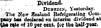 Dividend* Ddsedin, Yesterday. The Zealand Refrigerating Company baa declared an Interim dividend at ttw rate of to per cent, {or the ball-year.