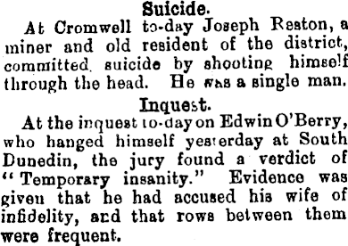 I Suicide. At Cromwell to-day Joseph Beaton, a miner and old resident of the district, committed, suicide by shooting hiraeelf through the head. He was a single man. Inquest. At the inquest io-dayon EdwinO’Berry, who hanged himself yesterday at South Dunedin, the jury found a verdict of “ Temporary insanity.” Evidence was given that he had accused his wife of infidelity, and that rows between them were frequent.