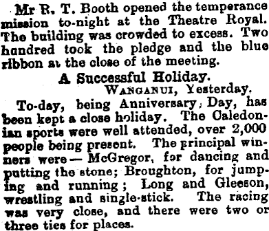 . Mr B. T. Booth opened the temperance 1r ;..t0-night at the Theatre Royal. The building was crowded to excess. Two hundred took the pledge and the blue ribbon av the close of the meeting. A Successful Holiday. Wanganui, Yesterday. To-day, being Anniversary, Day, has been kept a close holiday. The Caledonian sports were well attended, over 2,000 people being present. The principal winners were McGregor, for dancing and putting the stone; Broughton, for jumping and running; Long and Gleeson, wrestling and single-stick. The racing was very dose, and there were two or three ties for places.