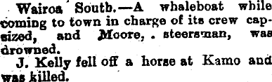 Wairoa * South. —A whaleboat while coming to town in charge of its crew capsized, and Moore, . steersman, was drowned. J. Kelly fell off a horse at Kamo and was killed.