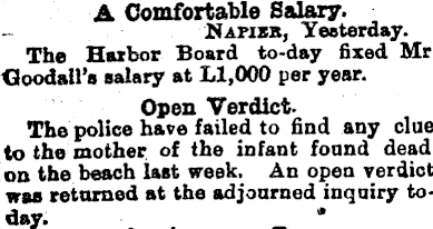 A Comfortable Salary. Napibk, Yesterday. The Harbor Board to-day fixed Mr Hoodail’s salary at LI,OOO per year. Open Verdict. The police have failed to find any clue to the mother of the infant found dead on the beach last week. An open verdict was returned at the adjourned inquiry to day.