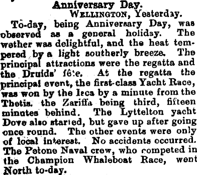 Anniversary Day. Wellington, Yesterday. To-day, being Anniversary Day, was observed as a general holiday. The wether was delightful, and the heat tempered ,by a light southerly breeze. The principal attractions were the regatta and the. Druids’ ffite. At the regatta the principal event, the first-class Yacht Race, was won by the Ires by a minute from the Thetis, the Zarifi'a being third, fifteen minutes behind. The Lyttelton yacht Dove also started, but gave up after going once round. The other events were only of local interest. No accidents occurred. The Pelone Naval crow, who competed in the Champion Whaleboat Race, went North to-day.