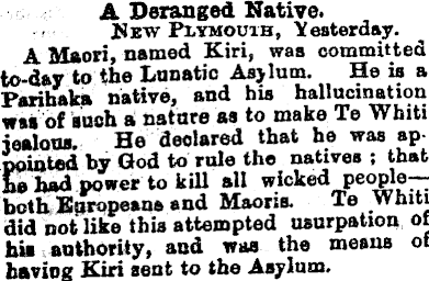 A Deranged Native. Uew Plymouth, Yesterday. A Maori, named Kiri, was committed to-day to the Donatio Asylum. He is a Paribaka native, and his hallucination was of ’suoh a nature as to make Te Whiti jealous. He declared that he was apno in ted hy Qod to rule the natives ; that C had power to kill all wicked peopleboth Bursmeana and Maoris. Te Whiti did not like this attempted usurpation of bis authority, and was the means of having Kiri sent to the Asylum.
