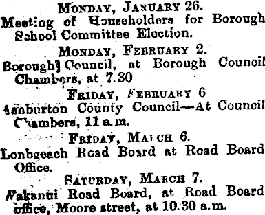 Monday, January 26. Meeting of Householders for Borough School Committee Election. Monday, February 2. Borough! Council, at Borough Cpuncil Chambers, at 7.30 Friday, f ebruahy 6 tshbiirton County Council—At Council CHambors, 11 a. m. ■ : Friday, Matca 6. Lonbgeech Bead Board at Hoad Board Office. Saturday, March 7. Fafeknut Hoad Board, at Road Board ibfficia,'Moore street, at 10.30 a.m.