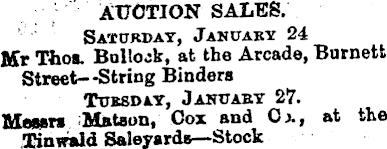 AUCTION SALES. ’ Saturday, January 24 Mr Thos. Bollock, at the Arcade, Barnett Street —String Binders Tuesday, January 27. Messrs Matson, Cox and Cj. , at the Tinwaid Saleyards—Stock