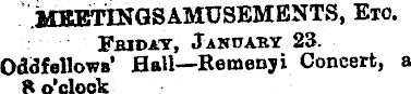 MEETINGSAMUSEMENTS, Etc. Friday, January 23. Oddfellows’ Hall—Remenyi Concert, al 8 o’clock