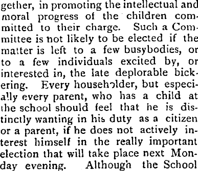 gether, in promoting the intellectual and moral progress of the children committed to their charge. Such a Committee is not likely to be elected if the matter is left to a few busybodies, or to a few individuals excited by, or interested in, the late deplorable bickering. Every householder, but especially every parent, who has a child at ihe school should feel that he is distinctly wanting in his duty as a citizen or a parent, if he does not actively interest himself in the really important election that will take place next Monday evening. Although the School