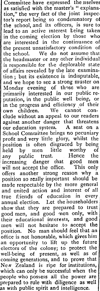 Committee have expressed the nselves as satisfied with the master’s “ explanation,” the very fact of the joint inspector’s report being so condemnatory of the school, and its officers, is sure to lead to an active interest being taken in the coming election by those who are interested in the continuance of the present unsatisfactory condition of the school. We do not assume that the headmaster or any other individual is responsible for the deplorable state of affairs revealed by the late examination ; but its existence is indisputable, and we hope to see a strong muster on Monday evening of those who are primarily interested in our public reputation, in the public well being, or in the progress and efficiency of their own children. We cannot conclude without an appeal to our readers against another danger that threatens our education system. A seat on a School Committee brings no pecuniary profit and very little glory, whilst the position is often disgraced by being held by men little worthy of any public trust. Hence the increasing danger that good men will not accept the office. This only offers another strong reason why a position so really important should be made respectable by the more general and united action and interest of all true friends of education in every annual election. Let the householders show that they are prepared to trust good men, and good men only, with their educational interests, and good men will not hesitate to accept the position. No man should feel that an office is not honorable, which gives him an opportunity to lift up the future electors of the colony; to protect the well-being of present, as well as of coming generations, and to prove that New Zealand is ripe for institutions, which can only be successful when the people who possess all the power are prepared to rule with diligence as well as with public spirit and intelligence.