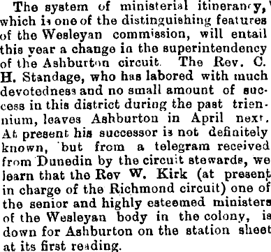 The system of ministerial itinerary,' which is one of the distinguishing features of the Wesleyan commission, will entail this year a change in the superintendency of the Ashburton circuit. The Rev. O. H. Standage, who has labored with much devotedness and no small amount of success in this district during the past triennium, loaves Ashburton in April next. At present his successor is not definitely known, but from a telegram received from Dunedin by the circuit stewards, we learn that the Rev W. Kirk (at present in charge of the Richmond circuit) one of the senior and highly esteemed ministers of the Wesleyan body in the colony, is down for Ashburton on the station sheet at its first reading.