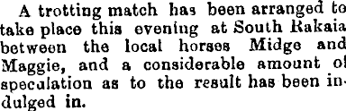 A trotting match has been arranged to take place this evening at South Kakaia between the local horses Midge and Maggie, and a considerable amount of speculation as to the result has been indulged in.