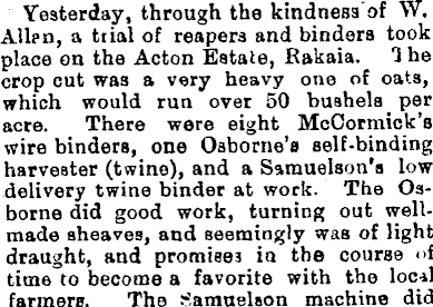 Yesterday, through the kindness of W. Allen, a trial of reapers and binders took place on the Acton Estate, Rakaia. Ihe crop cut was a very heavy one of oats, which would run over 50 bushels per acre. There wore eight McCormick’s wire binders, one Osborne’s self-binding harvester (twine), and a Samuelson'a low delivery twine binder at work. The Osborne did good work, turning out wellmade sheaves, and seemingly was of light draught, and promise! in the course <>f time to become a favorite with the local farmers. The Samuelson machine did