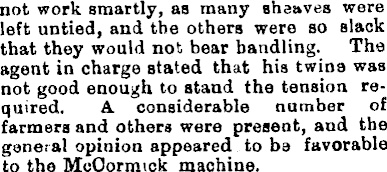 not work smartly, as many sheaves were left untied, and the others were so slack that they would not bear handling. The agent in charge stated that his twine was not good enough to stand the tension required. A considerable number of farmers and others were present, and the general opinion appeared to be favorable to the McCormick machine.
